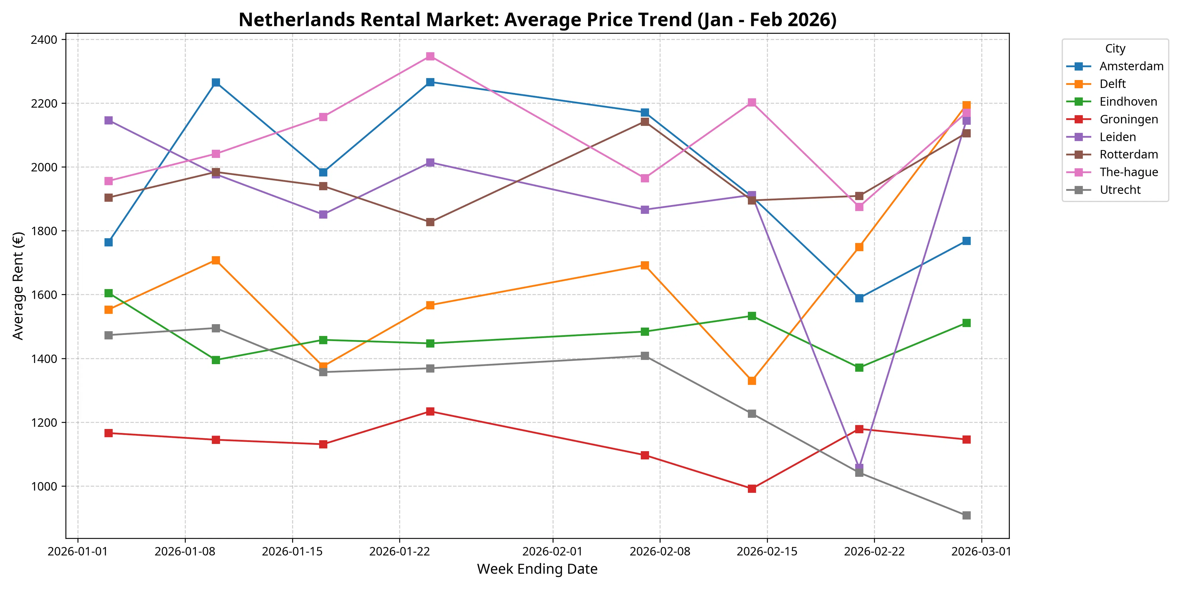 - The Premium Tier: Amsterdam (€1,964 avg) and The Hague (€2,089 avg) have solidified their position as the most expensive cities. The Hague, in particular, saw a surge in high-end listings in late January, with average prices peaking at €2,347.