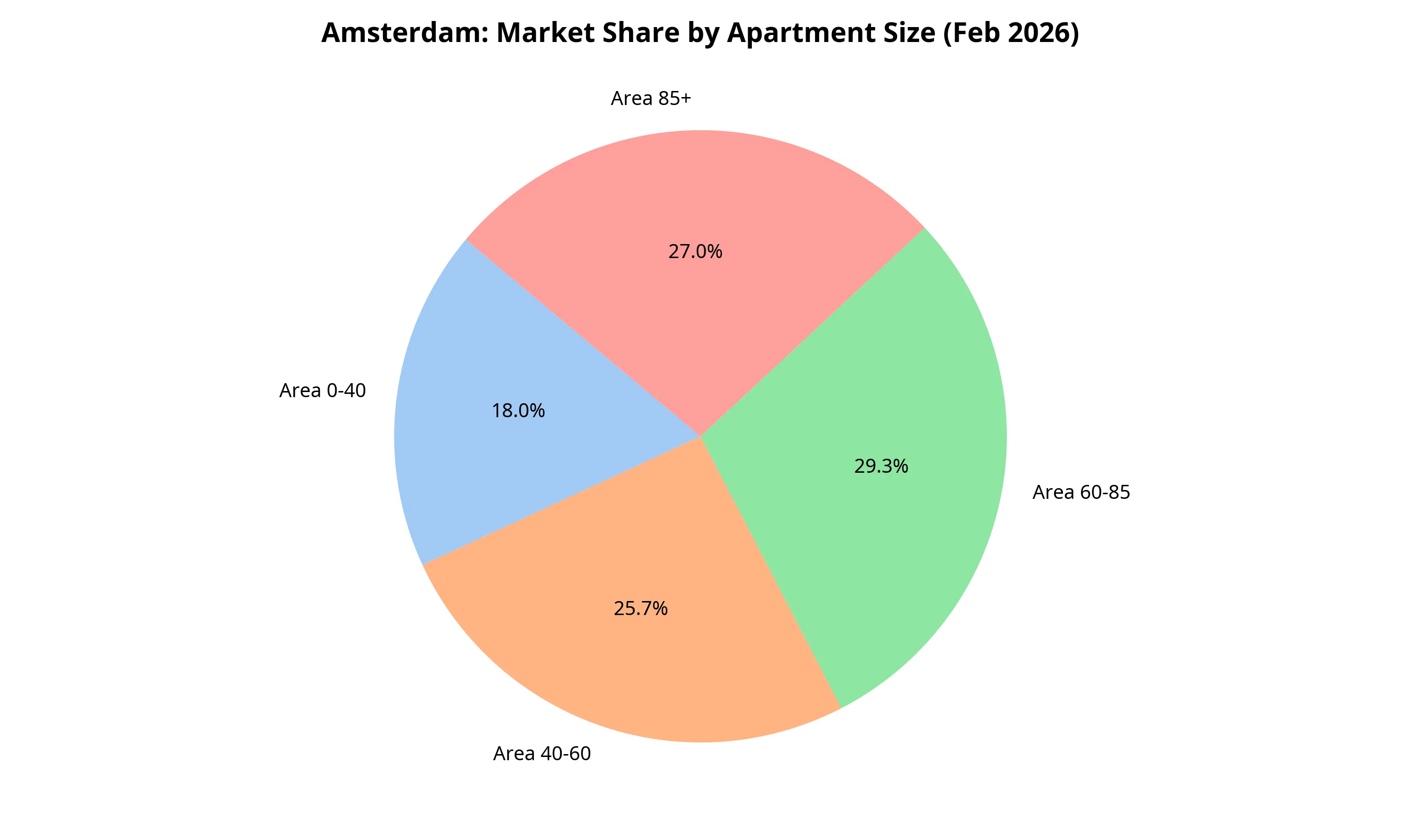- The Premium Dominance: Surprisingly, 42.4% of Amsterdam's new listings in February were in the 85m²+ category. This indicates that while the market for small and medium apartments is shrinking, the high-end luxury segment remains relatively active.