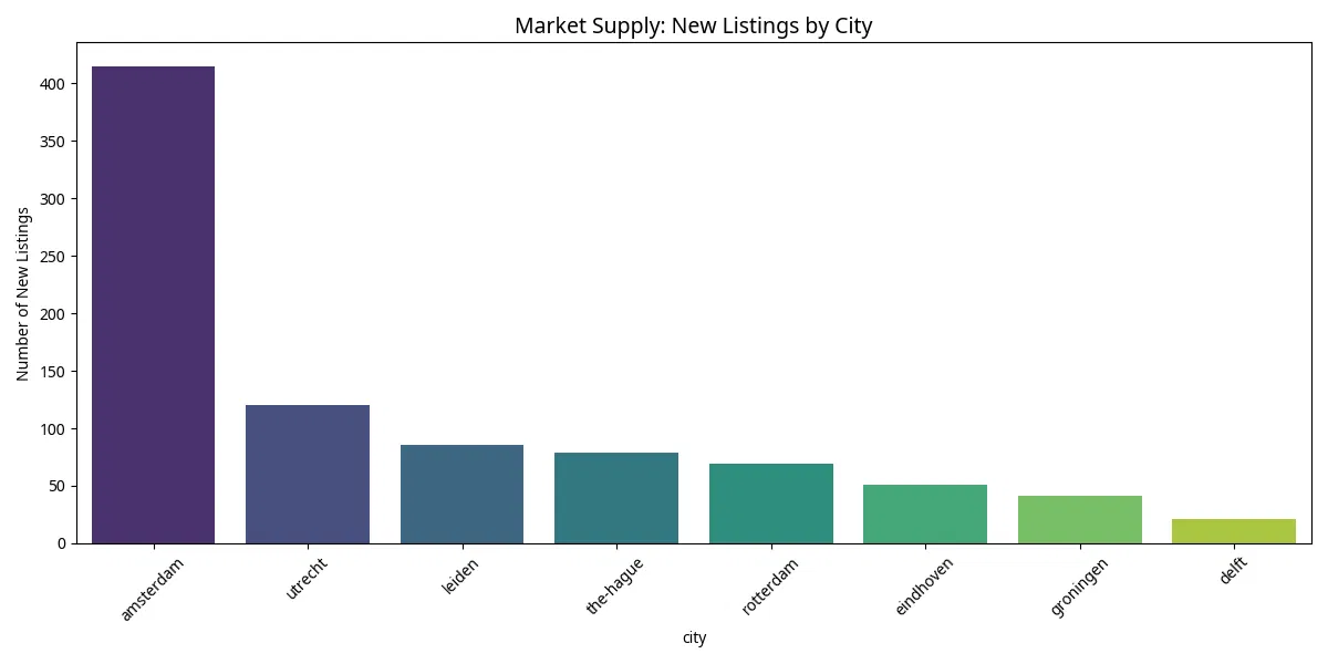 This week, the most significant trend outside of Amsterdam is the "Leiden Shockwave." The city has seen a dramatic surge in both supply (86 listings) and price (€1,880 avg), placing it firmly in the premium tier alongside The Hague and Rotterdam. This suggests that the affordability crisis is no longer confined to the largest cities but is spreading rapidly to secondary hubs.