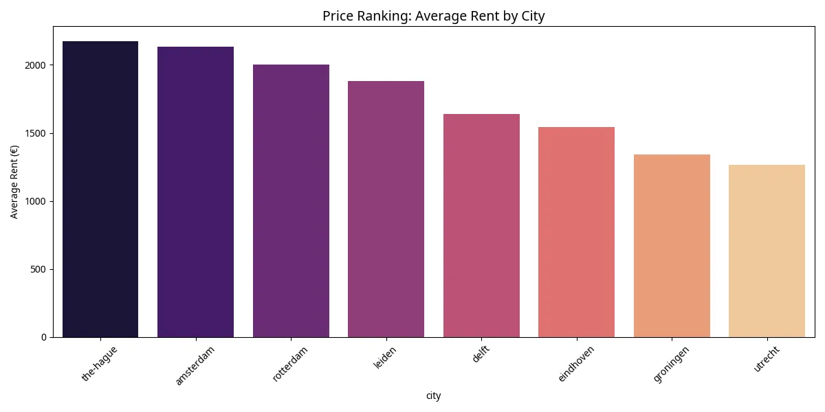 The dramatic surge in Leiden (86 listings, €1,880 avg) is a classic example of "Value Migration." As Amsterdam becomes unlivable, high-income professionals are shifting their search to secondary hubs. Leiden, with its high concentration of biotech and academic talent, is the primary beneficiary—and victim—of this shift. It is no longer a "cheap alternative" but has officially entered the premium tier alongside The Hague and Rotterdam.